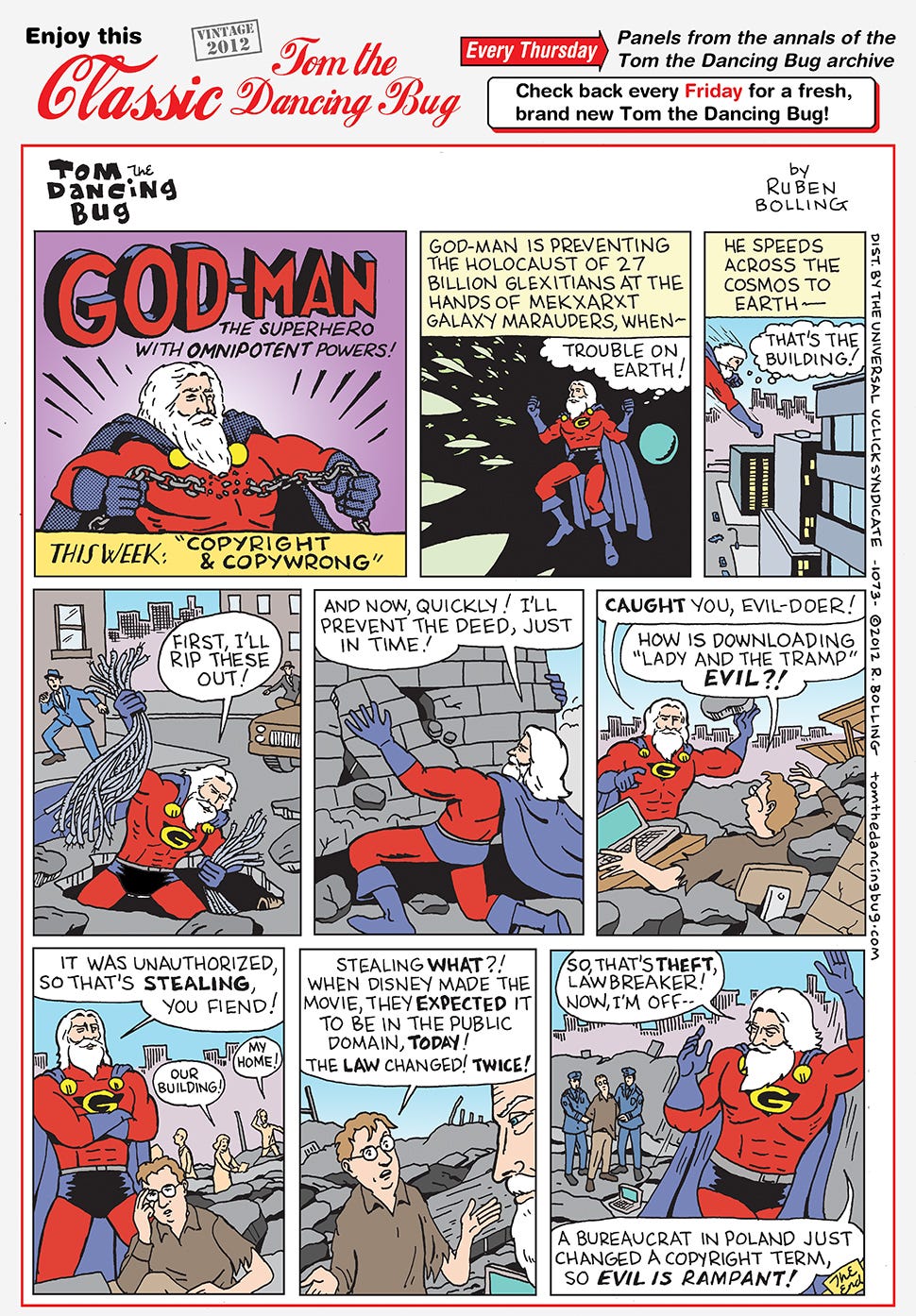 This week’s Classic Tom the Dancing Bug (published on GoComics yesterday) is God-Man, in “Copyright & Copywrong!” (from 2012).