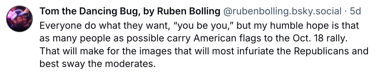 Here is the site where you can find how to join a No Kings rally this Saturday. The more people who come to these, the more we prove to ourselves that we are not alone. And prove to Republicans that there are people who will not roll over.
