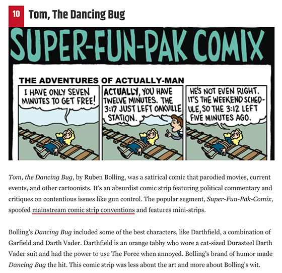 Tom[,] the Dancing Bug was listed as the #10 "great but forgotten 1990s newspaper comic strip." Yet by every measure except newspaper print clients (and this particular writer's memory) the comic strip is more successful now than ever. Definitely WAY more readers than ever.