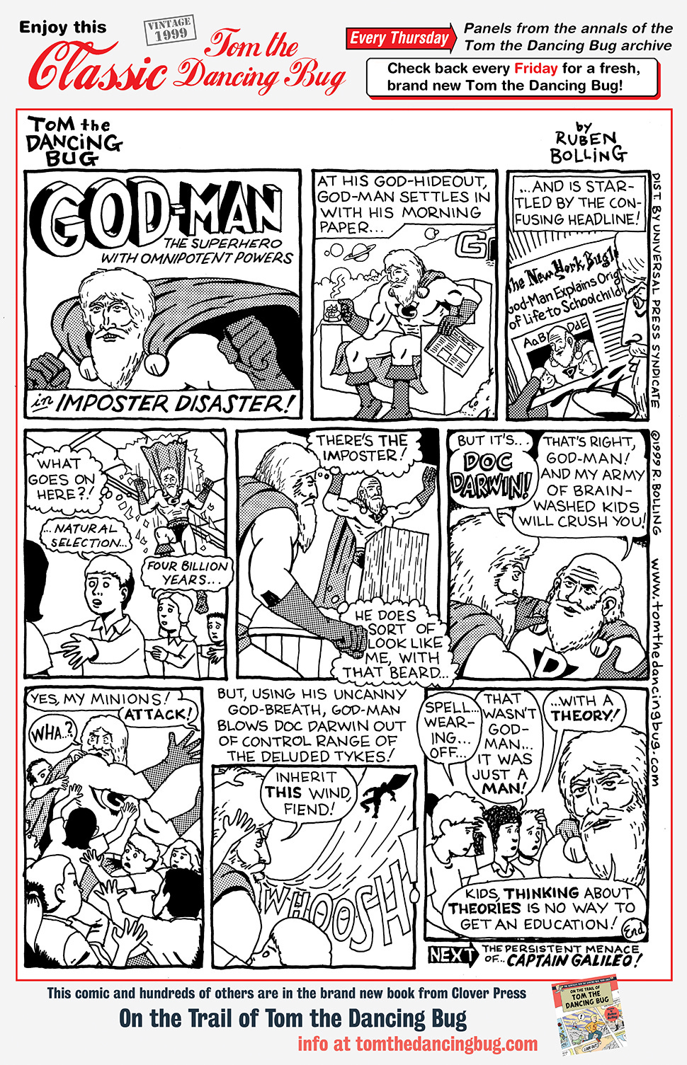 This week’s Classic Tom the Dancing Bug (published on GoComics yesterday) features God-Man, in “IMPOSTER DISASTER” (from 1999).
