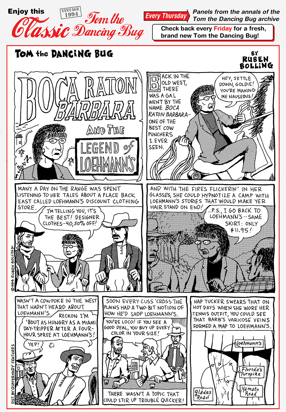 This week’s Classic Tom the Dancing Bug (published on GoComics yesterday) is “BOCA RATON BARBARA AND THE LEGEND OF LOEHMANN’S” (from 1994).