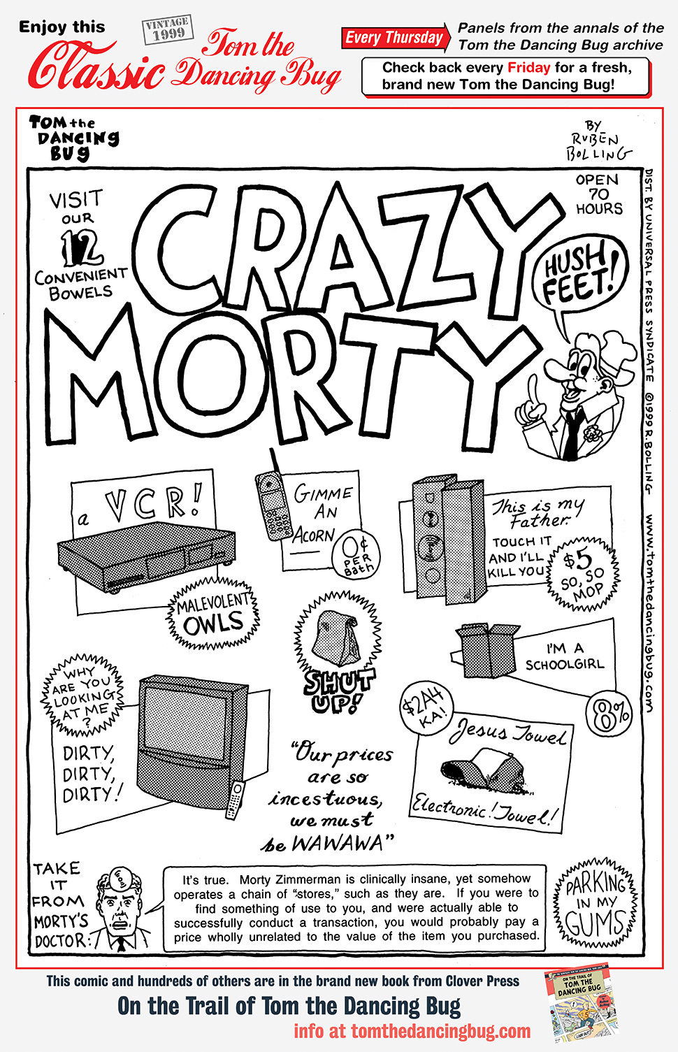 This week’s Classic Tom the Dancing Bug (published on GoComics yesterday) is “CRAZY MORTY” (from 1999).