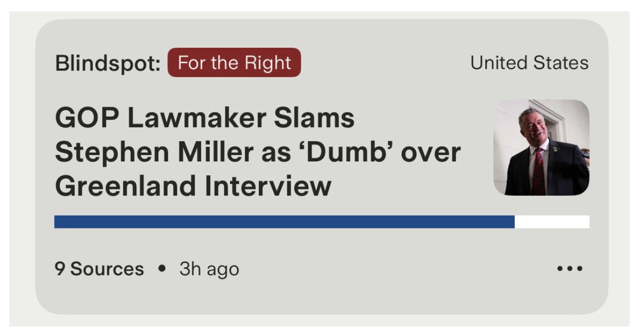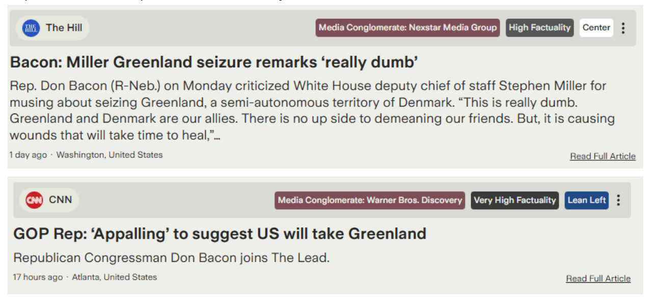 An example of Ground News’s features comes from a story from earlier this month: “GOP Lawmaker Slams Stephen Miller as ‘Dumb’ over Greenland Interview.” Miller had said on CNN that Greenland should be part of the United States, not ruling out military options. Republican Rep. Don Bacon responded, “This is really dumb.”