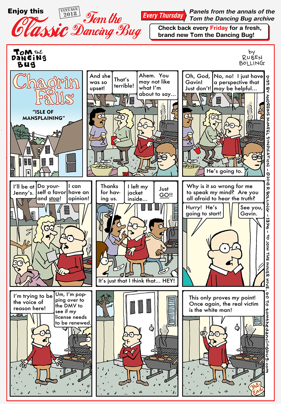 This week’s Classic Tom the Dancing Bug (published on GoComics yesterday) is Chagrin Falls: “Isle of Mansplaining” (from 2018).