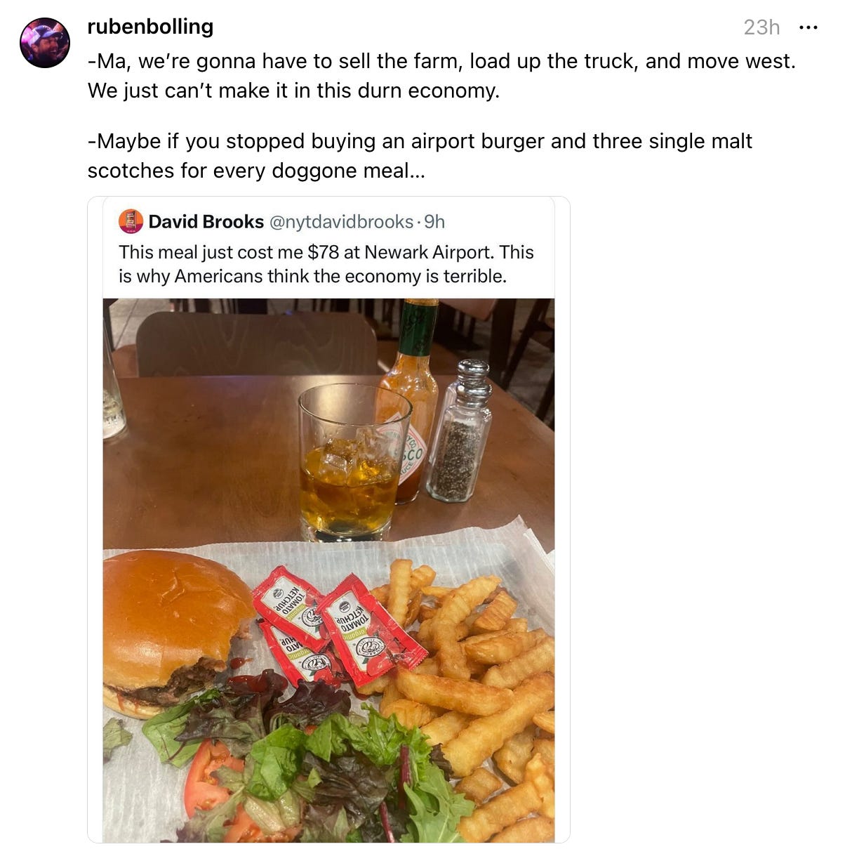 Everyone has had a lot of fun with NY Times columnist David Brooks’s apparently drunk airport twxxt with a pithy economic analysis.