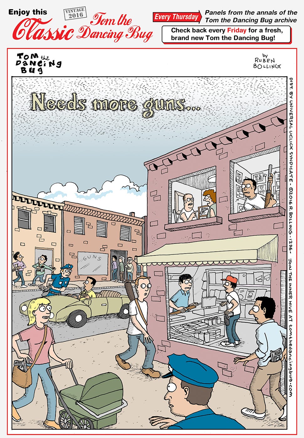 This week’s Classic Tom the Dancing Bug (published on GoComics yesterday) is “Needs more guns…” (from 2016).