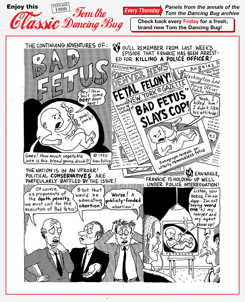 In celebration of the announcement of the new books compiling the first nine years of Tom the Dancing Bug, this week’s upcoming Classic Tom the Dancing Bug, to be published on the Tom the Dancing Bug gocomics.com page on Thursday, will be THE CONTINUING ADVENTURES OF BAD FETUS.