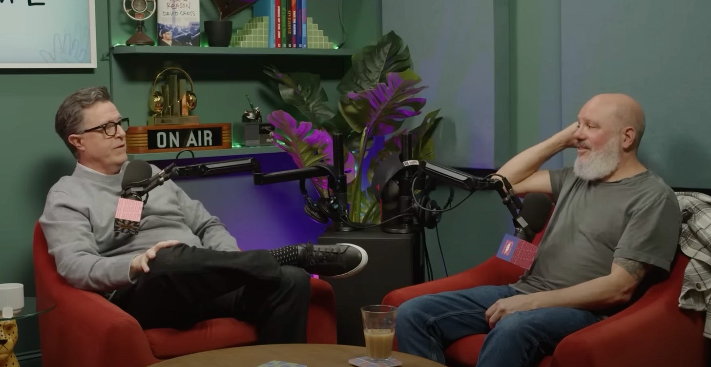 Last week, I was walking Otis and listening to a podcast: David Cross's podcast, with his guest Stephen Colbert. They got to talking about cartoonists, and Colbert mentioned meeting my friend Tom Tomorrow. I stopped in my tracks. I certainly don't expect to be included in every cartoonist conversation, but if they got to Tom Tomorrow but didn't mention me, I was going to be seething with jealousy. Thankfully, David (thank you, David) then asked Colbert if he'd ever met Ruben Bolling. Colbert's answer was a quick, "No," and they moved on.