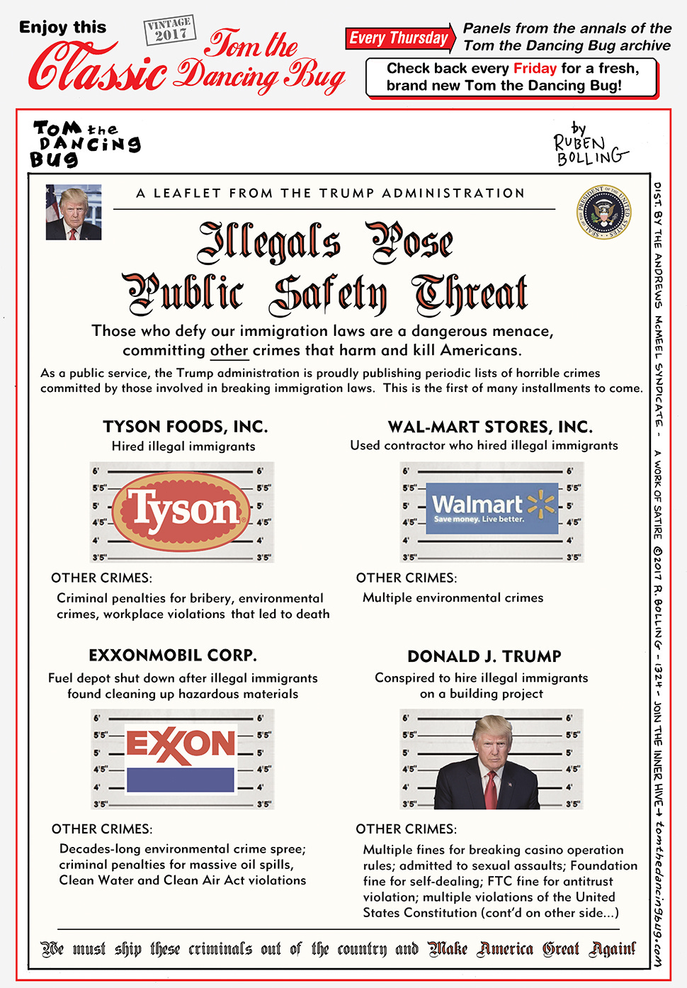 This week’s Classic Tom the Dancing Bug (published on GoComics yesterday) is “ILLEGALS POST PUBLIC SAFETY THREAT” (from 2017).